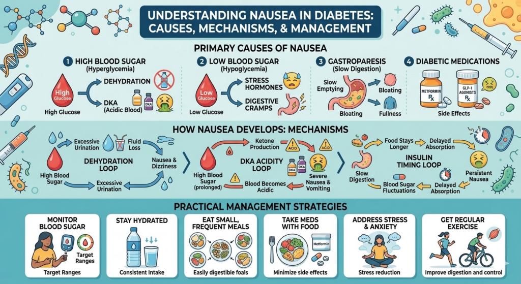 If nausea is accompanied by symptoms like dizziness, confusion, or sweating, it may be due to low blood sugar (hypoglycemia). On the other hand, nausea with symptoms like excessive thirst, frequent urination, or fruity-smelling breath may indicate high blood sugar (hyperglycemia) or diabetic ketoacidosis.